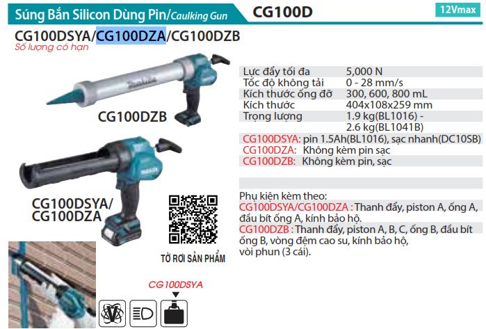 Makita CG100DZA SÚNG BẮN SILICON DÙNG PIN(12V MAX) (không kèm pin sạc) Chat Zalo