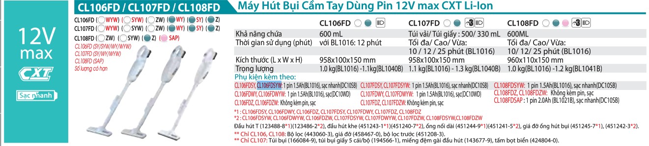 Makita CL106FDSYW là một trong những lựa chọn hàng đầu trong phân khúc máy hút bụi không dây nhỏ gọn. Với thiết kế tiện dụng, công suất mạnh mẽ và nhiều tính năng ưu việt, máy hút bụi này đáp ứng tốt nhu cầu làm sạch hàng ngày của bạn.