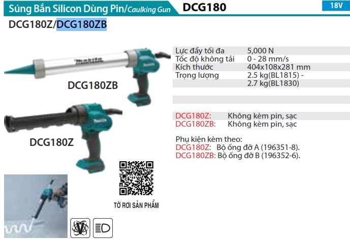 - Với lực đẩy tối đa lên tới 5,000 N, Makita DCG180Z có thể xử lý được các loại keo và silicone dày nhất, giúp bạn thực hiện các công việc khó khăn một cách dễ dàng.