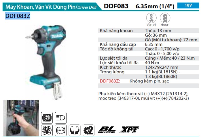 - Lực siết mạnh mẽ: Với lực siết tối đa lên đến 70 N·m ở mức thấp và 26 N·m ở mức cao, máy đảm bảo khả năng siết chặt hiệu quả các vít và đinh, phù hợp cho các công việc yêu cầu lực siết mạnh mẽ.