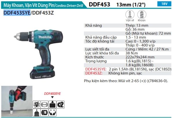 - Độ bền và hiệu suất ổn định: Được chế tạo từ các vật liệu chất lượng cao, Makita DDF453SYE đảm bảo độ bền và hiệu suất ổn định trong suốt quá trình sử dụng, là một công cụ đáng tin cậy cho các dự án xây dựng và sửa chữa.