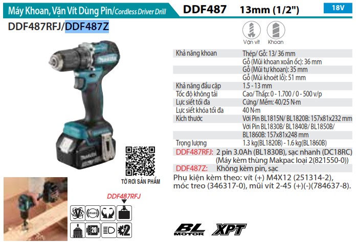 - Pin mạnh mẽ và lâu dài: Makita DDF487Z tương thích với nhiều loại pin của Makita, bao gồm BL1815N, BL1820B, BL1830B, BL1840B, BL1850B và BL1860B. Sự lựa chọn đa dạng này cho phép bạn sử dụng pin có dung lượng phù hợp với nhu cầu công việc, đảm bảo hiệu suất hoạt động tối ưu.