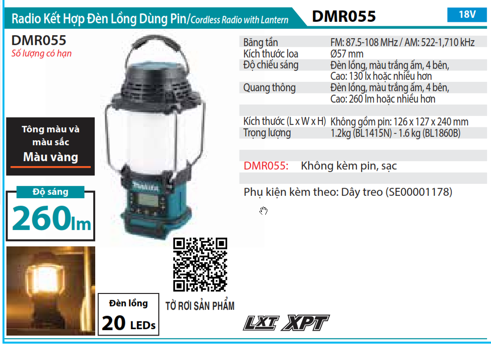Makita DMR055 RADIO KẾT HỢP ĐÈN LỒNG DÙNG PIN(18V/14.4V) Sản phẩm hoàn hảo với mọi dự án và công việc gia đình. Khách hàng luôn khen ngợi và quay lại mua thêm