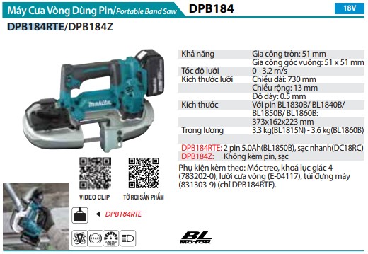 - Hiệu Suất Vượt Trội: Máy cưa vòng Makita DPB184RTE được trang bị động cơ mạnh mẽ với tốc độ lưỡi có thể điều chỉnh từ 0 đến 3.2 m/s, giúp cắt các vật liệu kim loại một cách nhanh chóng và chính xác. Khả năng gia công tròn và gia công góc vuông với kích thước lên đến 51 mm mang lại sự linh hoạt tối đa cho người sử dụng.