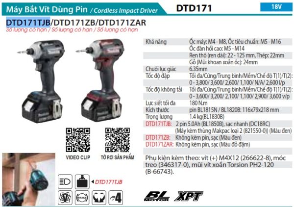 - DTD171TJB được trang bị nhiều chế độ tốc độ đập và tốc độ không tải, cho phép bạn tùy chỉnh theo yêu cầu công việc. Với các chế độ cứng, trung bình, mềm và các chế độ T(1) và T(2), bạn có thể kiểm soát hiệu suất máy phù hợp với từng loại vật liệu và ứng dụng.