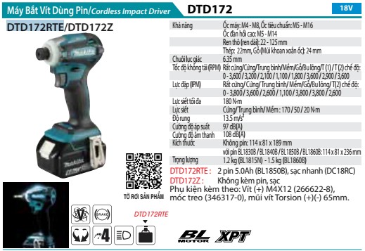 - Pin Linh Hoạt: Makita DTD172RTE có thể hoạt động với nhiều loại pin khác nhau, từ BL1815N đến BL1860B, cung cấp khả năng làm việc liên tục và thời gian sử dụng linh hoạt.