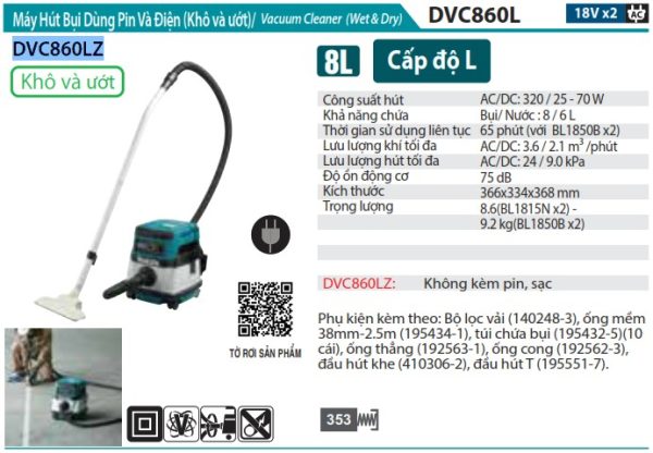 Makita DVC860LZ MÁY HÚT BỤI DÙNG PIN VÀ ĐIỆN(ƯỚT&KHÔ) (không kèm pin sạc) Đảm bảo với người mua sản phẩm chất lượng cao, sử dụng bền bỉ. Rất đáng đồng tiền