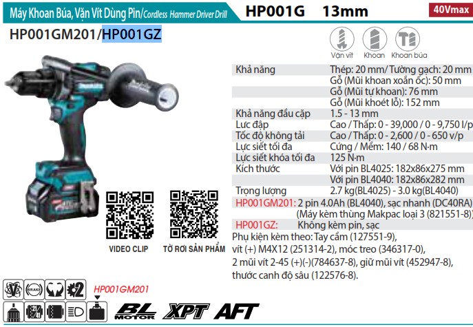 - Lực siết vượt trội: Makita HP001GZ cung cấp lực siết tối đa lên đến 140 N·m cho các ứng dụng siết cứng và 68 N·m cho các ứng dụng siết mềm, đảm bảo hiệu suất tối ưu trong mọi tình huống.