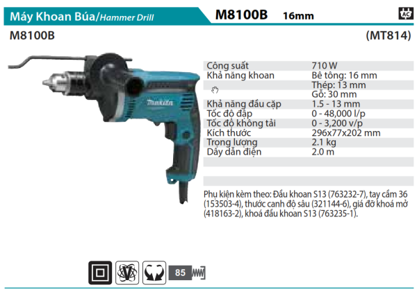 - Công Suất Mạnh Mẽ: Với công suất lên đến 710 W, máy khoan Makita M8100B dễ dàng xử lý các bề mặt cứng như bê tông, thép và gỗ, giúp bạn hoàn thành công việc một cách nhanh chóng và hiệu quả.